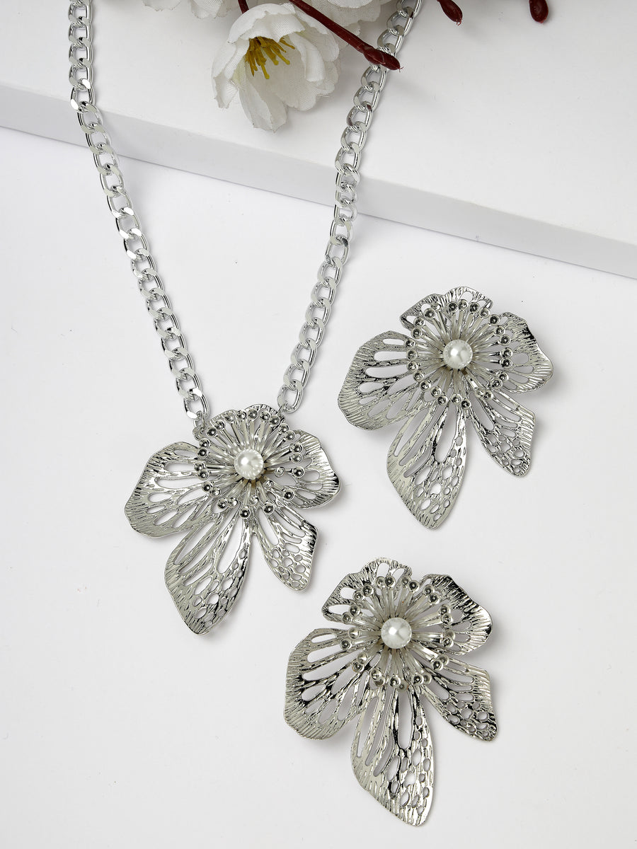 Sparkling Silver-Coloured Flower Pendant And Earrings Set