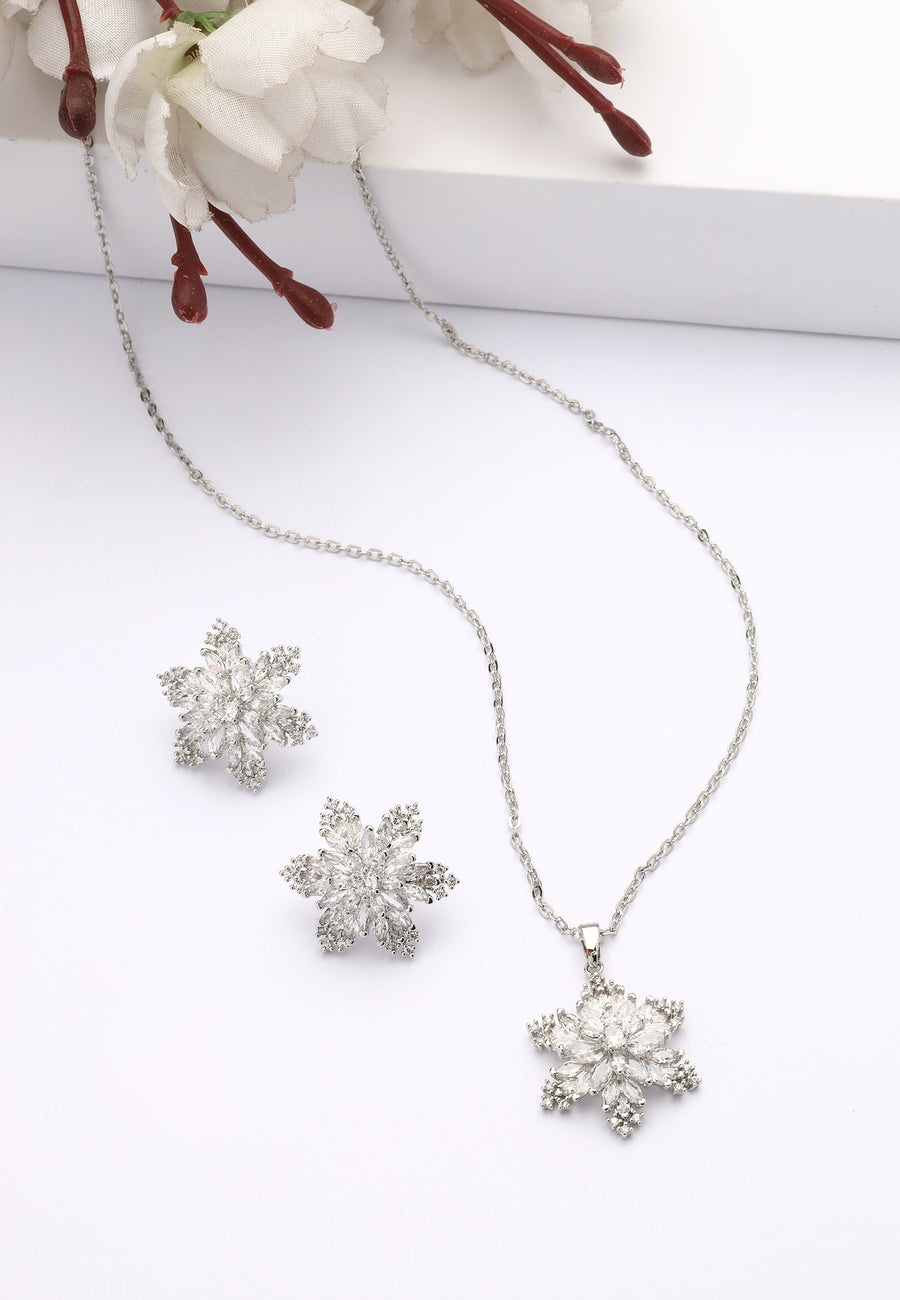 Tämä lumoava korusetti on talvinen ihmemaa, joka on toteutunut! Herkät lumihiutale-riipukset ja korvakorut on koristeltu häikäisevällä valikoimalla kimaltelevia kiviä, luoden taianomaisen ja vangitsevan ilmeen. Se on täydellinen tapa lisätä ripaus...