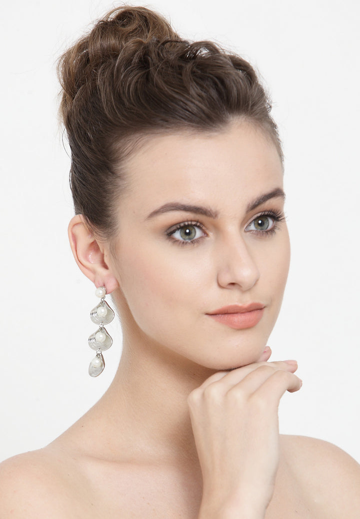 Meren ja simpukankuorten kauneus ilmentyy täydellisesti näissä upeissa helmikorvakoruissa. Hopeinen sävy korostaa kuninkaallista ilmettä. Yhdistä se sinisen mekon kanssa rantajuhliin tai juhlaan