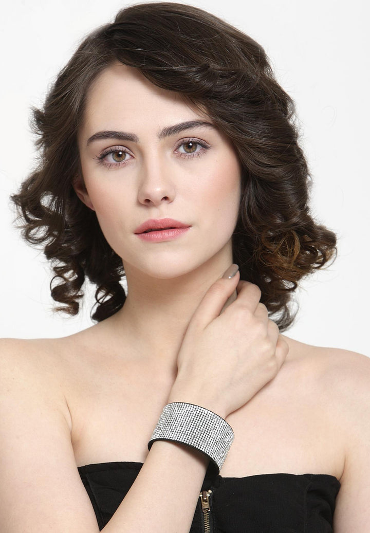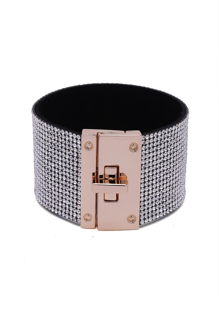 Wrap your wrist in pure diva energy. This wide leather cuff is drenched in clear crystals, creating a clear shimmer that feels straight off the red carpet. Lined with soft suede and finished with a sleek, high-polish clasp, it’s a bold, luxurious statement piece for nights when you want all eyes on you.