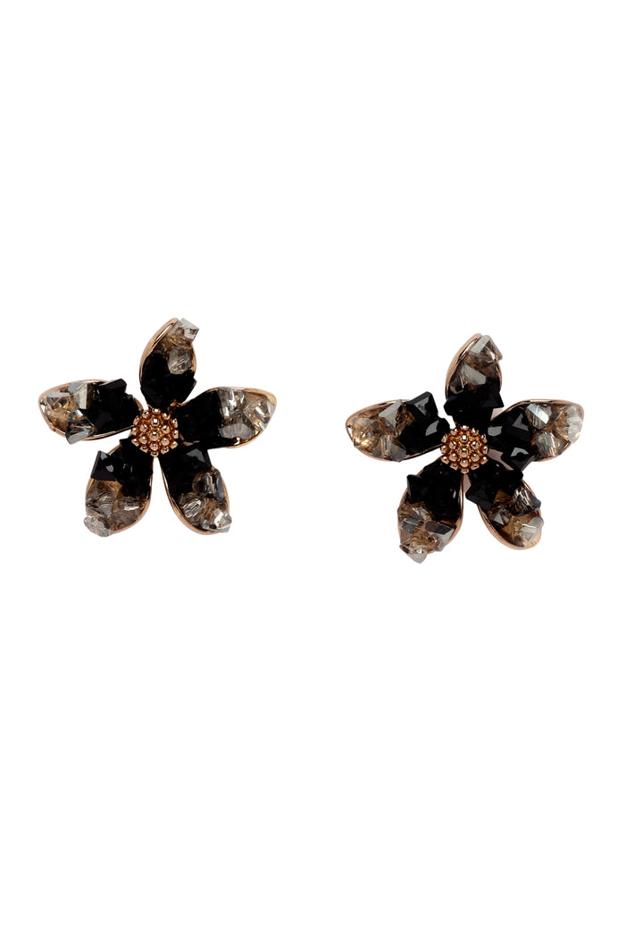 Glittering White Crystal Flower Stud Earrings with a black crystal stone at the centre are stunning and unique accessories that can add a touch of glamour and sophistication to any outfit. These earrings feature a flower-shaped design with sparkling white crystals surrounding a black crystal in the center. These earrings would particularly complement outfits with black or white colors.