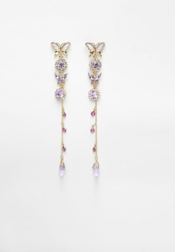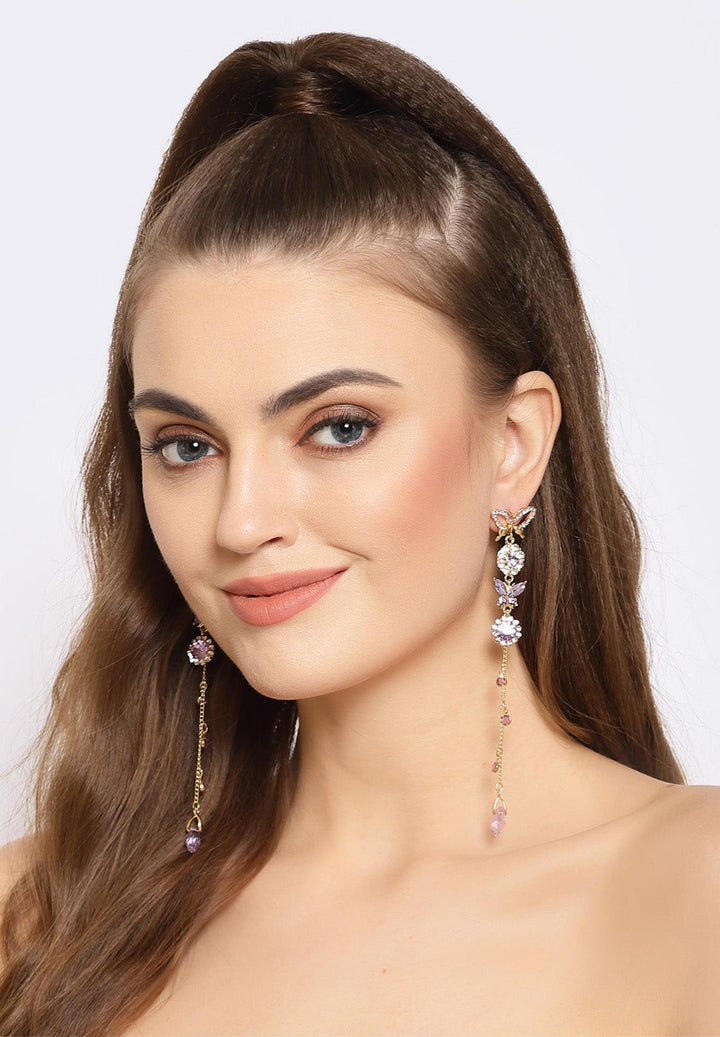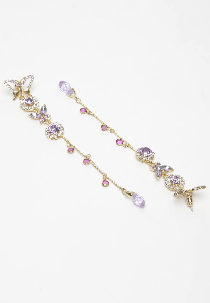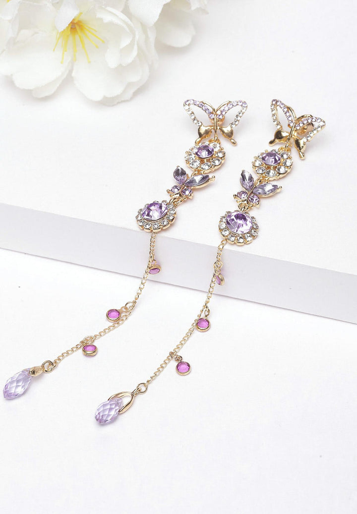 Social butterfly or not, try these hanging butterfly earrings designed with crystals, charms, and strings in purple and gold. Pair with darker shades of clothing so jewelry and outfit complement each other well.
