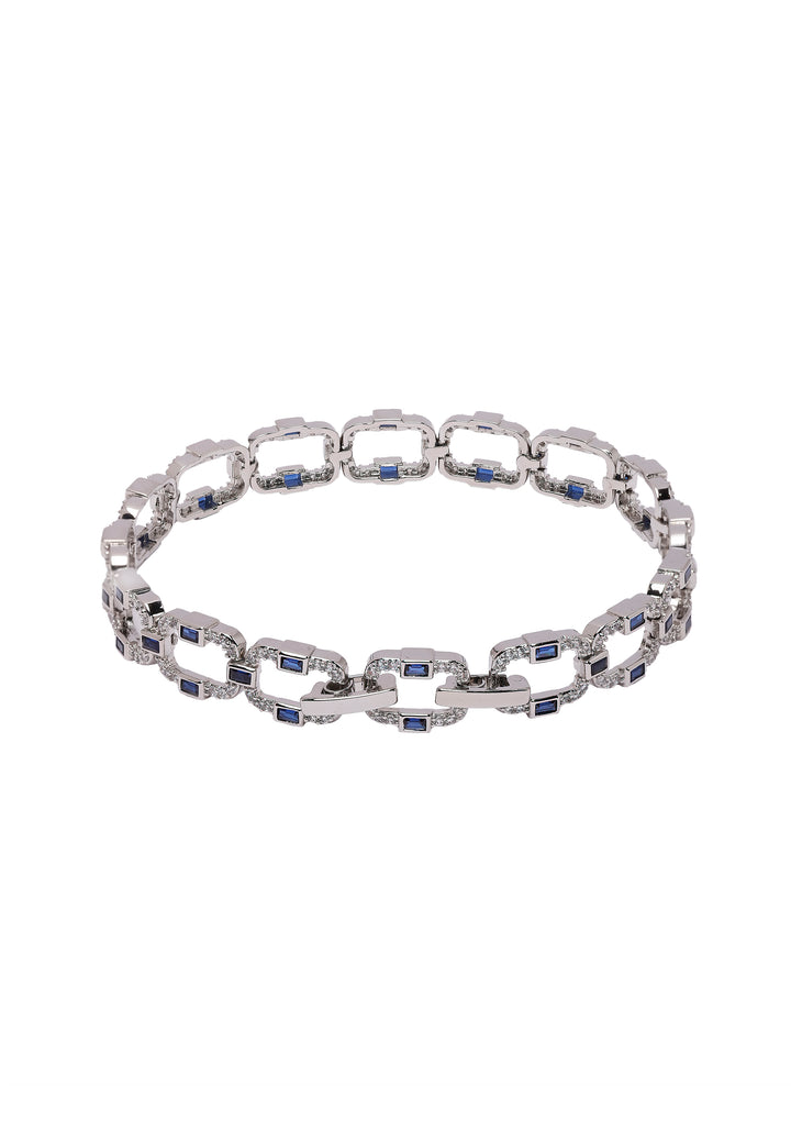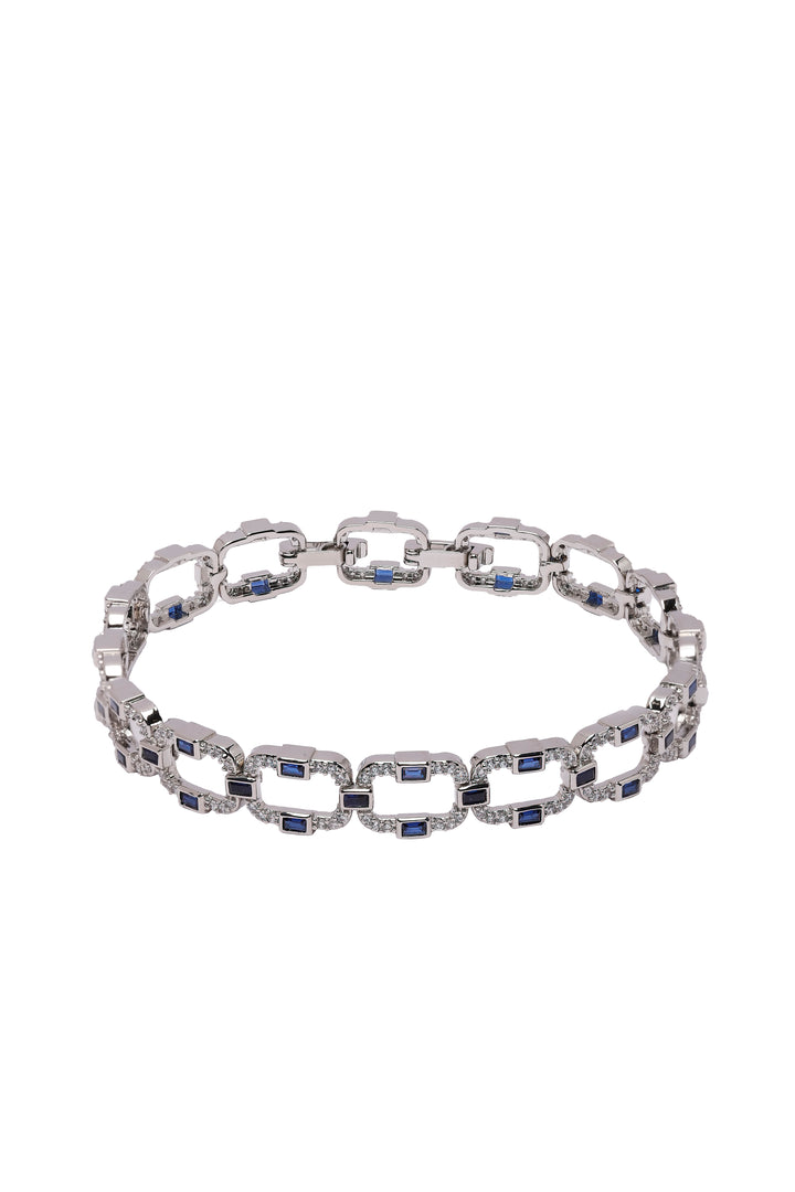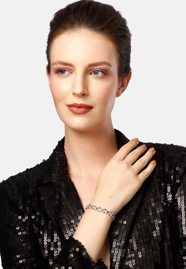 The Diva Interlock Bracelet is silver in color and adorned with cubic zirconia. It is a stunning piece of jewelry that exudes elegance and sophistication. This bracelet is from the diva collection. The high-quality cubic zirconia stones are designed to mimic the brilliance of real diamonds, providing a luxurious look. This modern and classic design makes it suitable for a wide range of outfits, from casual to formal. Its timeless design and sparkling stones make it a perfect choice for enhancing your style.