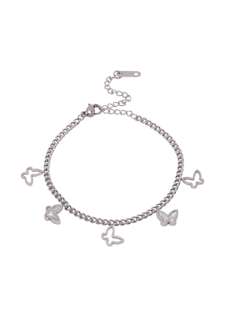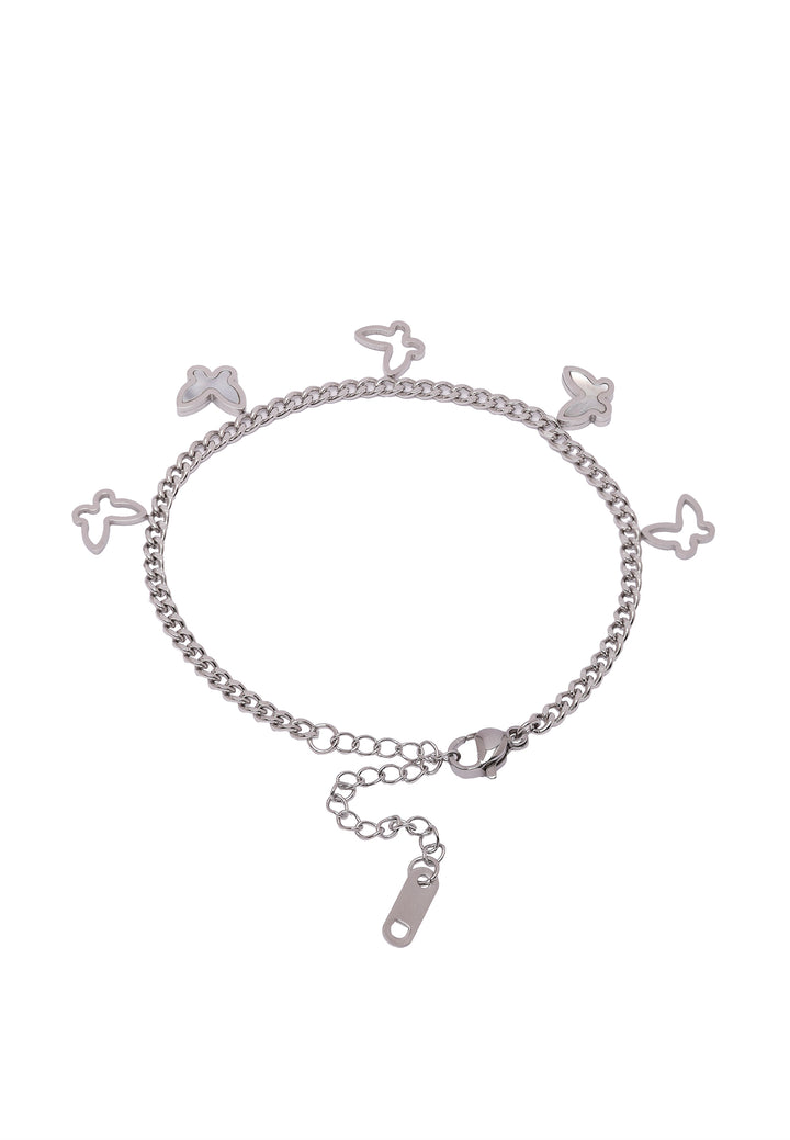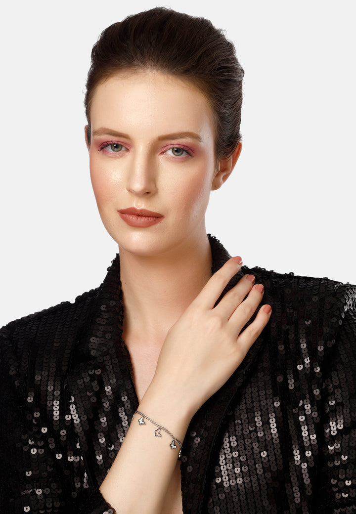 The Diva Dainty Butterfly Bracelet from the Diva Collection in silver color features a dainty chain adorned with butterfly charms, creating a whimsical and feminine aesthetic. The bracelet showcases small butterfly charms, crafted with intricate detailing to resemble the delicate wings of butterflies. Wear it alone for a subtle yet charming look, or layer it with other bracelets for a trendy and personalized style statement. he inclusion of cubic zirconia stones adds a touch of sparkle, enhancing the bracelet's allure and making it suitable for both everyday wear and special occasions.