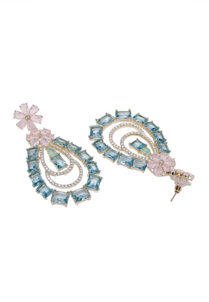 Cubic zirconia Diva Luxury Pendant Earrings in multicolor, featuring a combination of green and pink, are a stunning example of exquisite craftsmanship and elegant design. These earrings are from the Diva collection. Consider outfits in solid colors that match or contrast with the earrings' hues for a cohesive look. These earrings, adorned with double flower motifs at the top in light pink hues, and a series of square stones leading to oval drops, offer a harmonious blend of vibrant colors and sophisticated shapes, making them a perfect accessory for special occasions and glamorous events.