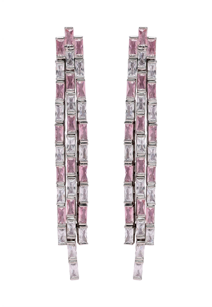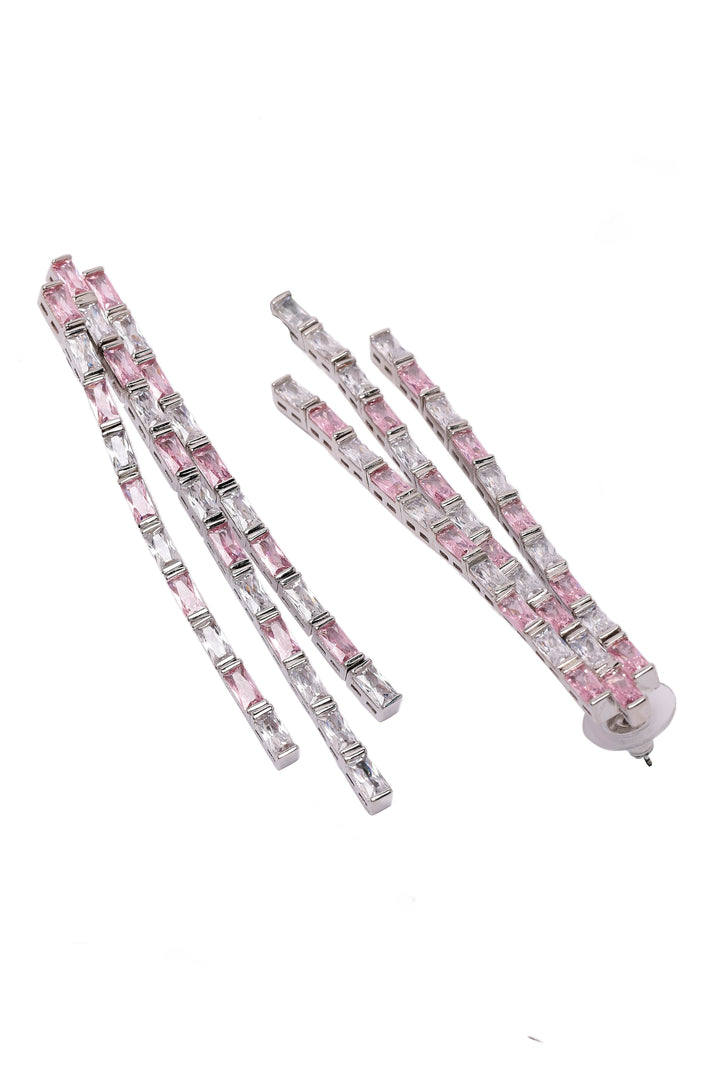 The Diva Chain Tassel Earrings with pink cubic zirconia stones are a gorgeous and stylish piece of jewelry that blends modern aesthetics with classic elegance. These earrings are from the Diva collection. Their distinctive three-tassel design, which features a longer middle and two shorter side tassels, produces a dynamic and well-balanced appearance that works well for various settings. They look stunning with evening gowns or cocktail dresses, adding a touch of sophistication and elegance. These earrings can also add a touch of glamour to more casual outfits, making them a standout piece for any occasion.