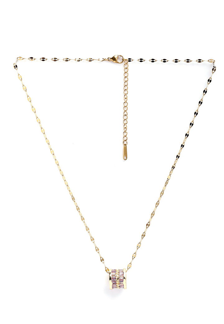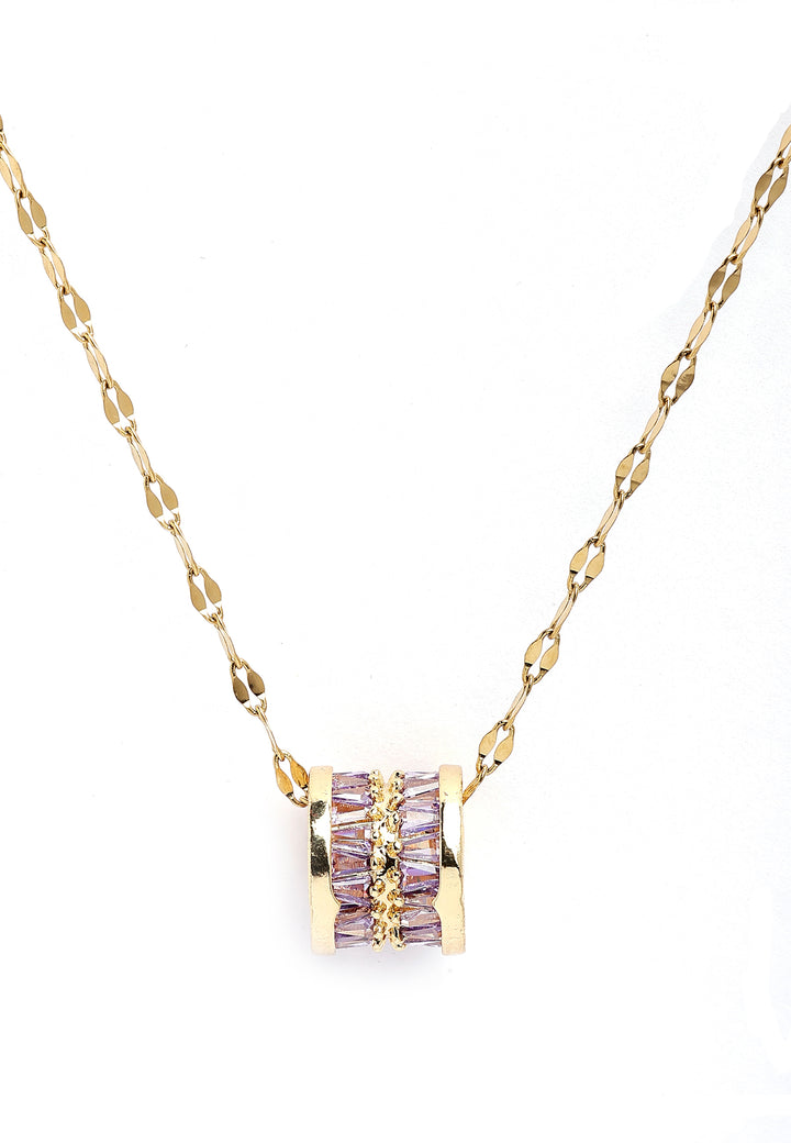 The Elegant Cylinder Inlaid Chain Necklace featuring a gold-colored chain with a purple cubic zirconia cylinder is an eye-catching piece. The focal point of the necklace is a small cylinder pendant, inlaid with purple cubic zirconia stones. This necklace is suitable for various occasions, from casual outings to formal events, adding a subtle yet sophisticated charm to any outfit. Wear it alone for a minimalist and refined look. This necklace is sure to be a standout piece, combining elegance with a touch of color and modern design.