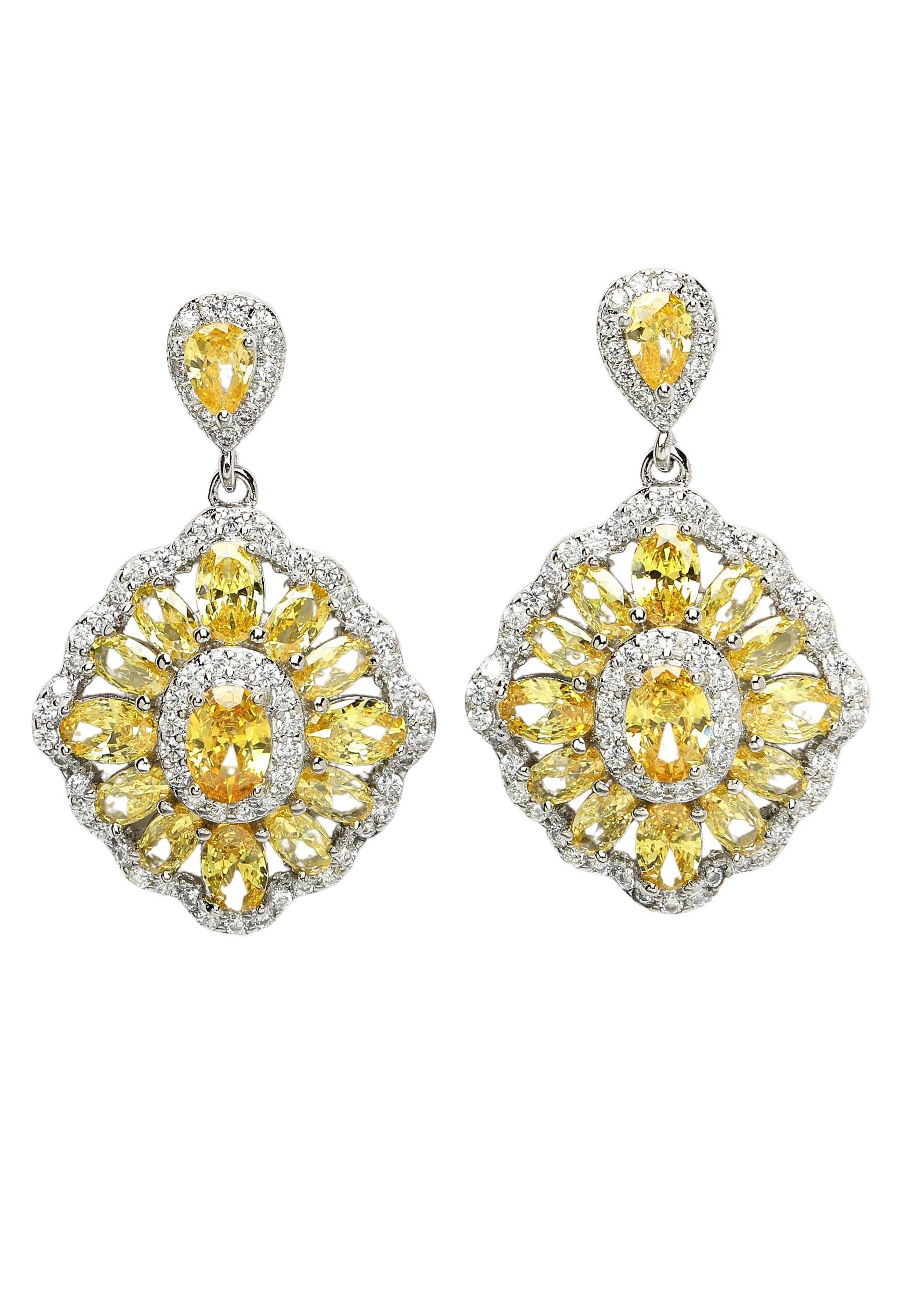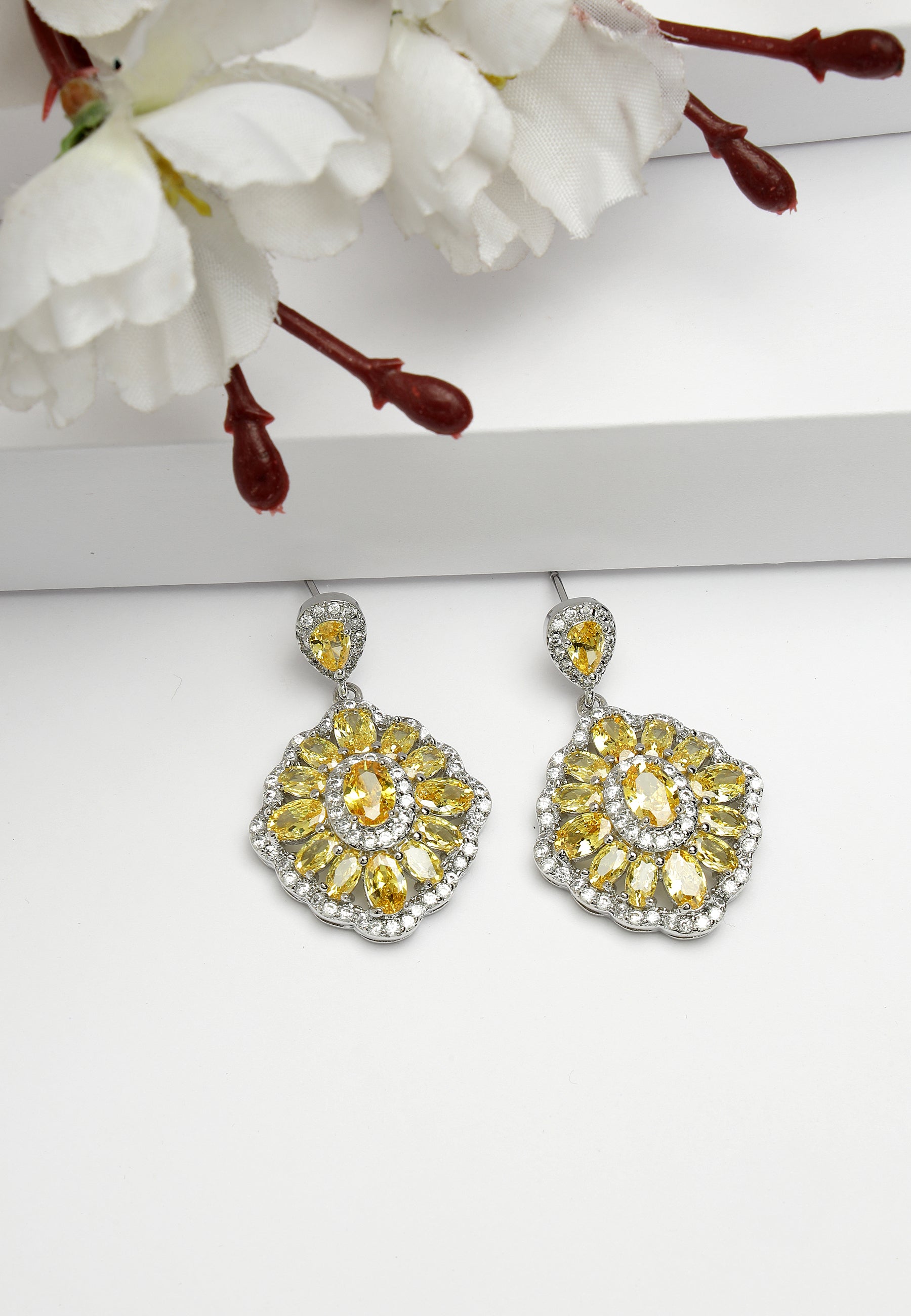 De Cubic Zirconia Statement Earrings in geel zijn een stralend en opvallend accessoire dat warmte en levendigheid uitstraalt. Deze statement-oorbellen zijn voorzien van oogverblindende zirkoniastenen in een heldere gele tint, gerangschikt in een ingewikkeld en boeiend ontwerp. Met hun opvallende ontwerp en stralende kleur zijn de gele oorbellen met zirkonia's het perfecte accessoire om een ​​vleugje glamour en persoonlijkheid toe te voegen aan elk ensemble. Of je nu een speciaal evenement bijwoont of gewoon je dagelijkse stijl naar een hoger niveau wilt tillen, deze oorbellen zullen zeker verblinden en verrukken.
